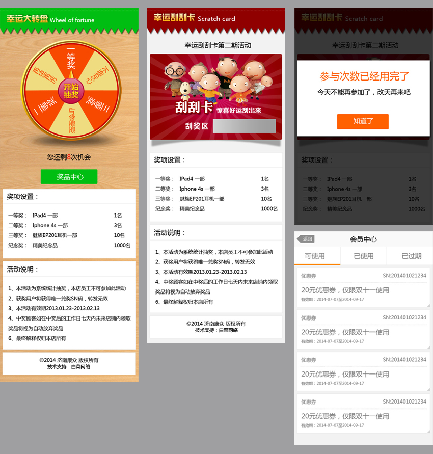 采用html5技術,實現大轉盤和刮刮卡功能,后臺可設置活動獎品、中獎率、參與次數以及對活動內容進行跟蹤管理