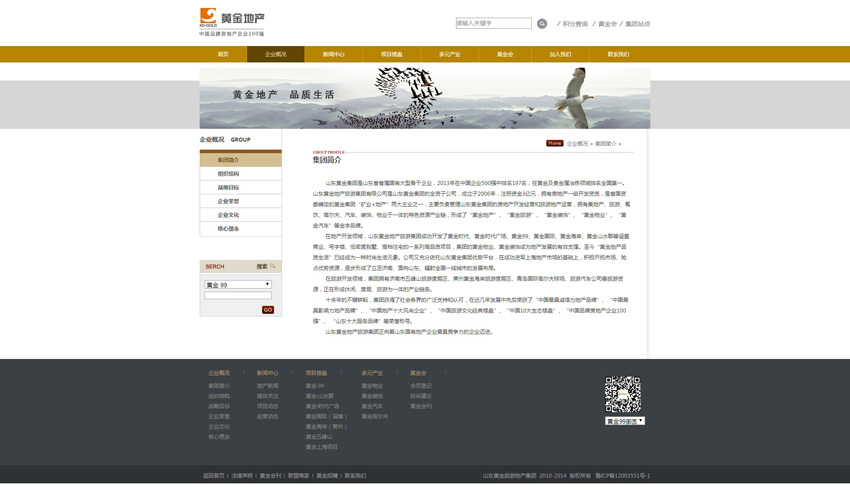 山東黃金集團是山東省省屬國有大型骨干企業,2013年在中國企業500強中排名197名,在黃金及貴金屬冶煉領域排名全國第一。山東黃金地產旅游集團有限公司是山東黃金集團的全資子公司,成立于2006年,注冊資金3億元,擁有房地產一級開發資質,是省國資委確定的黃金集團“礦業+地產”兩大主業之一,主要負責管理山東黃金集團的房地產開發經營和旅游地產運營,擁有集地產、旅游、餐飲、高爾夫、汽車、裝飾、物業于一體的特色資源產業鏈,形成了“黃金地產”、“黃金旅游”、“黃金裝飾”、“黃金物業”、“黃金汽車”等金字品牌。