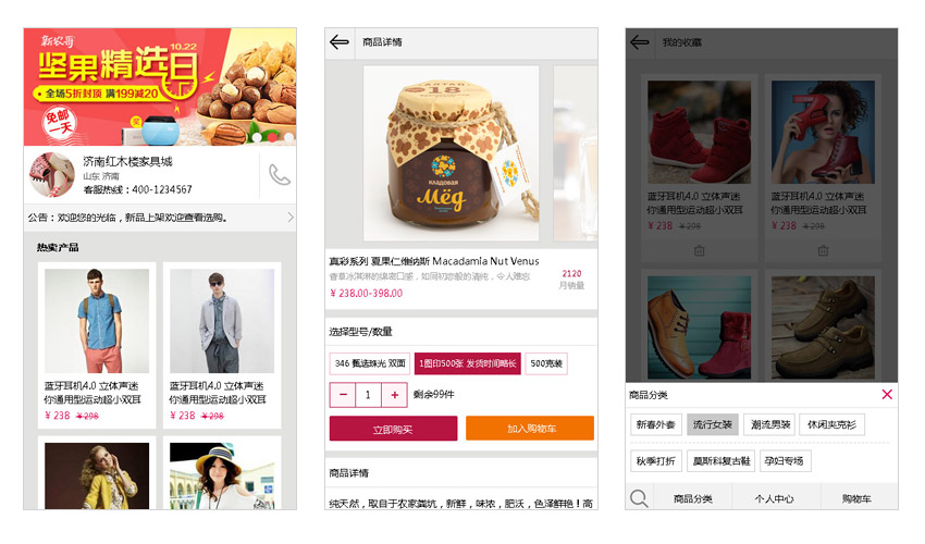 移動端商城系統,是一套白菜網絡根據客戶要求定制開發的一套手機端商城系統,系統還實現了與微信公眾號的對接,可直接在微信中進行購買和支付等相關操作。