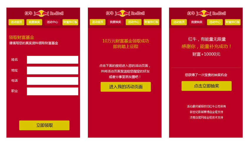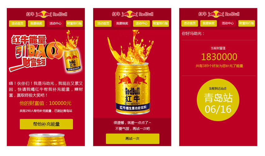2013年,我們為紅牛量身定制了一套微信活動?;顒硬捎胔tml制作。用戶通過關注紅牛官方微信,并領取活動財富,轉發朋友圈,并積攢財富,疊加抽獎的形式進行,活動期間參與人數達到2萬人次,有效的進行了品牌推廣和增加粉絲關注。