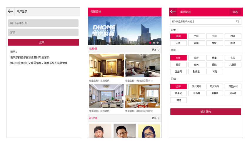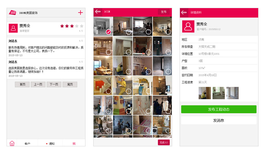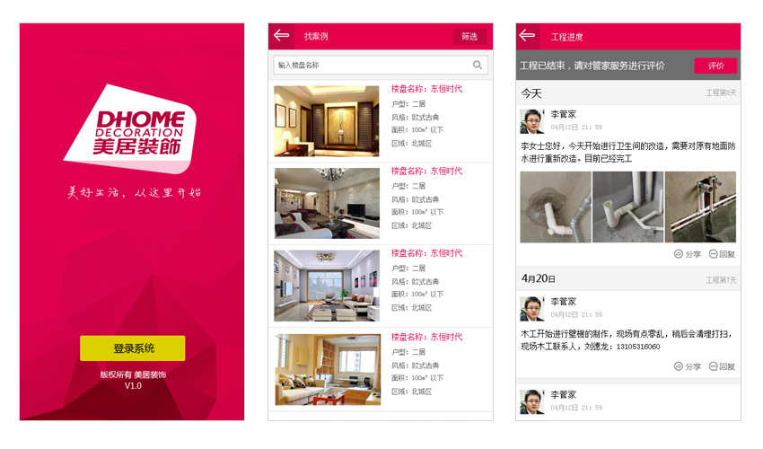 銀座美居裝飾業務app分為客戶端和業務段,客戶端,用戶可跟蹤裝修進度,與裝修管家進行互動,業務段app,裝修管家可更新發布裝修進程,與客戶進行互動交流