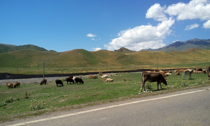 路邊隨處可見的牛羊,悠閑的吃著草,喝著山泉水