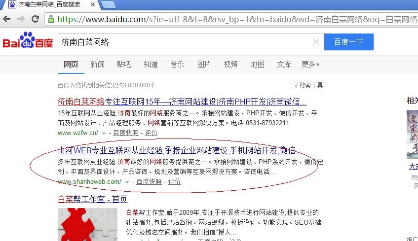百度搜索“濟南白菜網絡”該公司赫然在列,SEO信息都不修改,作甚?
