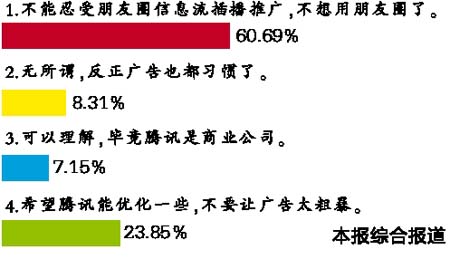 針對微信強推朋友圈廣告,IT之家做了一項調查,調查顯示超過六成的微信用戶表示無法接受,而在新浪科技發起的投票活動中,不能接受朋友圈廣告的用戶更是高達88.8%,大部分用戶非常排斥這種行為(作為對手,這更像新浪自己的態度)。