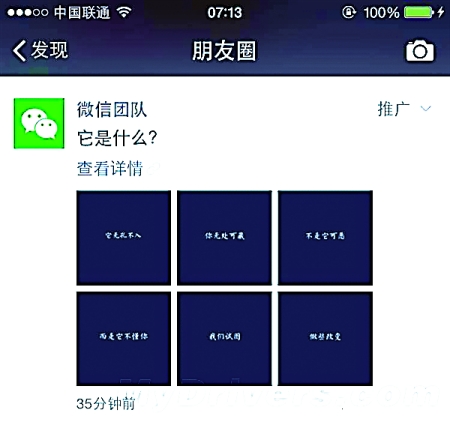 微信團隊昨天推送的那條試用廣告的初衷,應該是希望廣告高大上的同時,不引起用戶反彈情緒。網友人多力量大,只要成為討論熱點,傳播分享是很容易達到的。